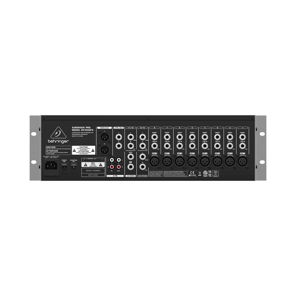 EURORACK PRO RX1202FX позволяет оперировать 8 монофоническими и 2 стереофоническими каналами. Входная секция расположена на задней панели корпуса. Помимо основных разъёмов там находятся гнёзда разрывов для моноканалов, к которым можно подключить компрессоры, предусилители и другое вспомогательное оборудование, восемь микрофонных входов, предусилители для которых уже встроены в EURORACK PRO RX1202FX, и вход 2-Track. Для подключения к микшеру конденсаторных микрофонов можно подать на входы фантомное питание 48 V. Инструменты настройки звучания включают в себя двухполосные канальные эквалайзеры, 60-миллиметровые логарифмические фейдеры громкости и регуляторы баланса. Все поворотные контроллеры являются герметичными, что позволяет избежать «расстройки» во время эксплуатации. Избегать превышения уровня сигнала помогают индикаторы клиппирования. Для каждого канала предусмотрено по два посыла на шины: префейдерный, для выходов мониторинга, и постфейдерный – для встроенного или внешнего эффект-процессора.