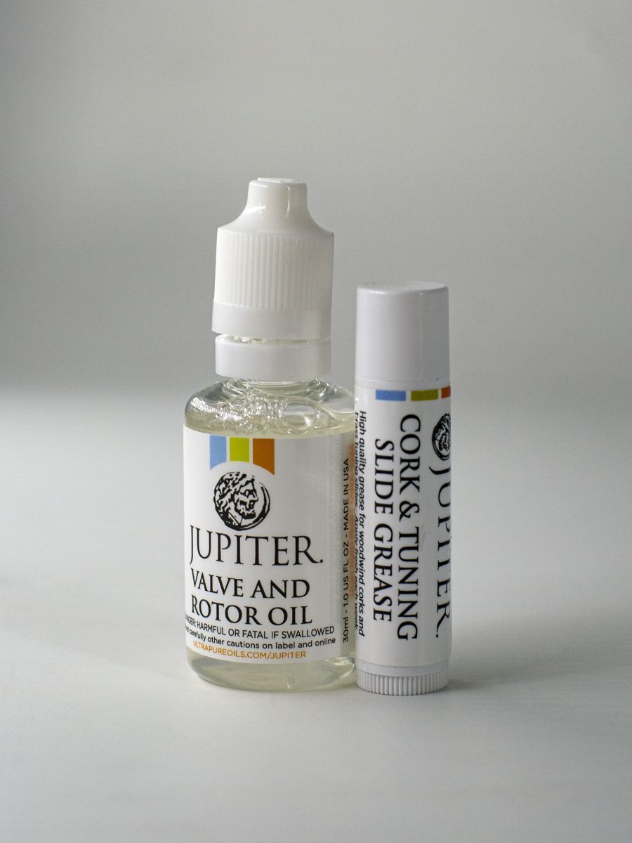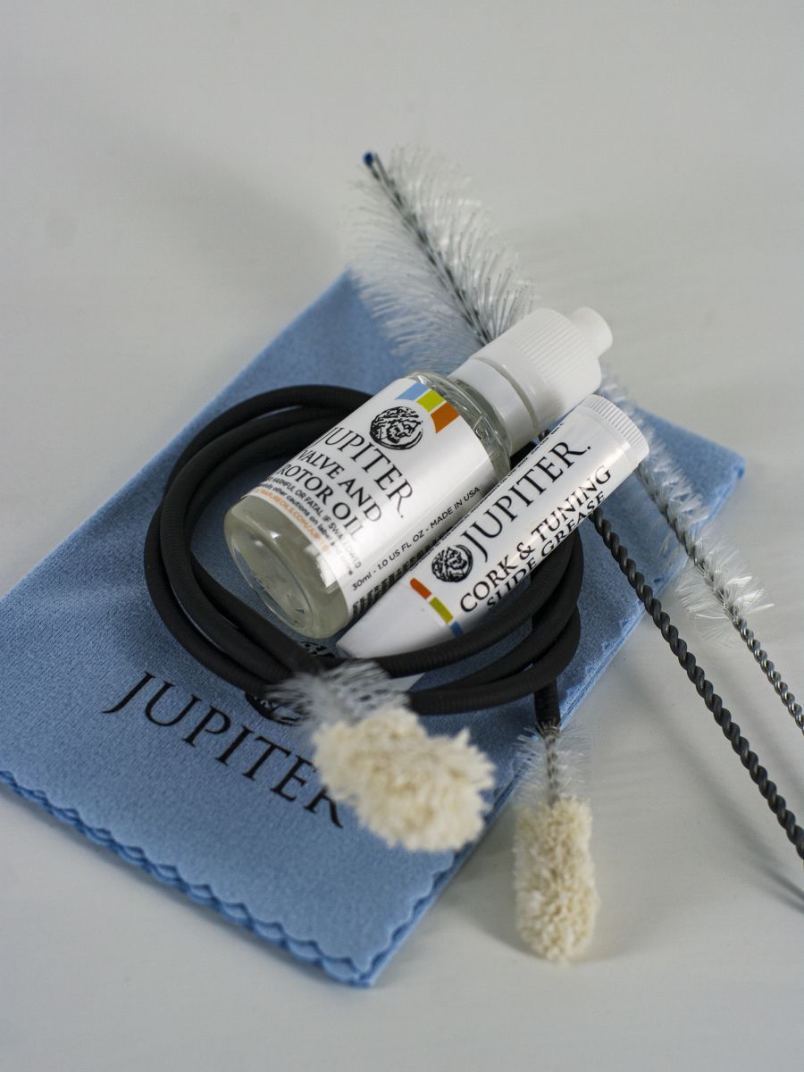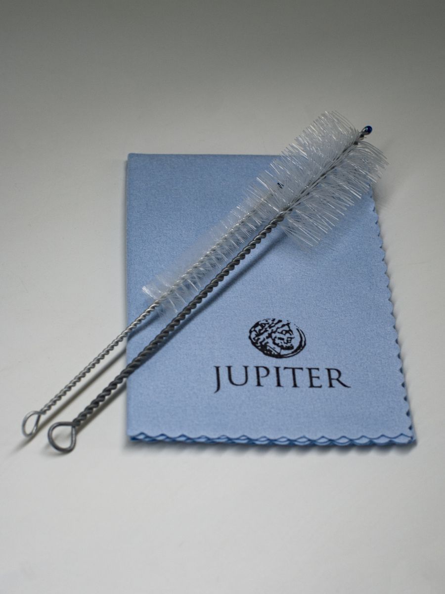 Jupiter JCM-TRK1 Набор для ухода за трубой включает: полировальную салфетку, масло для клапанов и крона, смазка для настроечного крона, ершик для мундштука, ершик для клапанов, гибкий ершик для канала ствола