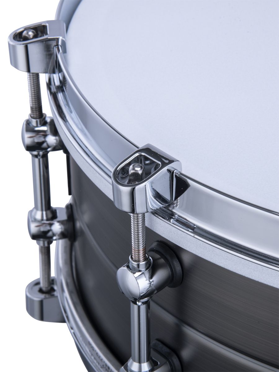 Размер: 14” x 6,5” Корпус: латунь (1,2 мм) Фурнитура корпуса: хромированная Кромка подшипника: внутренняя острая 45° (с обеих сторон) Отделка: матовый античный никель Обод: однофланцевый (латунь) Ударный пластик: Remo Diplomat с покрытием Резонансный пластик: Remo Diplomat Hazy Сторона малого барабана Сетчатый фильтр: OP-01 Кабели малого барабана: ST16-1403 без покрытия из нержавеющей стали (4) 0,6 мм и (10) 0,8 мм и (2) 1,0 мм Модификатор частоты: PFM1465