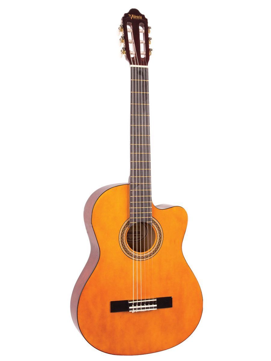 Valencia VC104C – это качественная полноразмерная классическая гитара с вырезом. Инструмент имеет универсальный характер звучания, поэтому подходит для различных музыкальных жанров и стилей игры. Корпус гитары изготовлен из липы, которая обладает усиленными резонансными особенностями. Гриф из нато имеет удобную форму и оптимальную ширину. Накладка выполнена из клена. Вырез эргономичной формы дает удобный доступ к верхним ладам. Натуральное покрытие Valencia VC104C положительно влияет не только на внешний вид инструмента, но и на его звуковые характеристики. Надежная колковая механика прекрасно держит строй и обеспечивает легкость при настройке. Нейлоновые струны, установленные на комфортной для игры высоте, придают звучанию особую мягкость. Стильная, удобная и доступная по цене гитара Valencia VC104C – идеальный вариант для начинающих музыкантов.